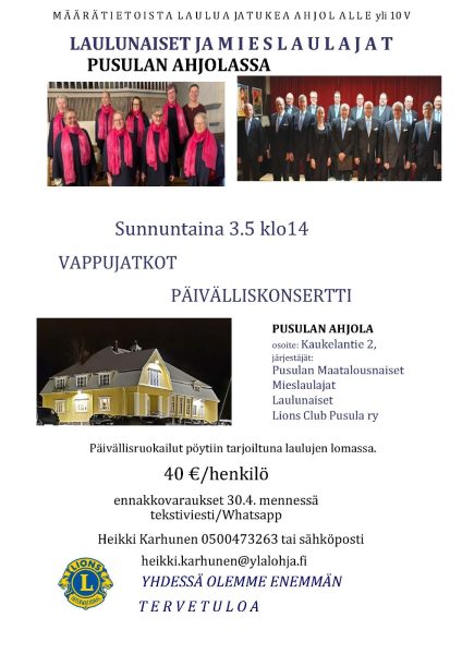 Laulunaisten ja Mieslaulajien päivälliskonsertti sunnuntaina 3.5.2026 kello 14. Päivällisruokailu 40 €/henkilö pöytiin tarjoiltuna. Ennakkovaraukset 30.4. mennessä Heikki Karhunen txt. tai Whatsapp 0500 473 263 tai sähköposti heikki.karhunen(at)ylalohja.fi.