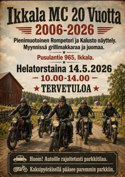 | Ikkala Mc 20 vuotta | Pusulantie 965 | 14.5.2026 | 10:00 | 14:00 |