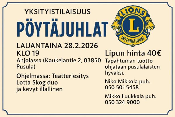 | Pöytäjuhlat | Kaukelantie 2 (Ahjola) | 28.2.2026 | 19:00 |