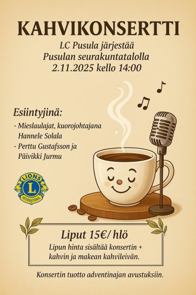 | Kahvikonsertti | Marttilantie 1, Pusulan seurakuntatalo | https://pusula.lions.fi | 2.11.2025 | 14:00 |