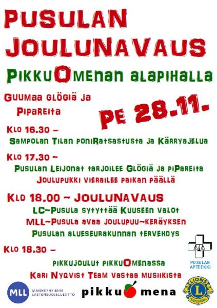 Poniratsastusta, kärryajelua, Pusulan Lions Club jakaa glögiä ja piparia. Joulupukki vierailee. Kuuseen sytytetään valot, joulupuukeräyksen avaus, musaa… |
